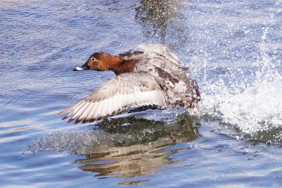 | 凄まじい勢いで翼を動かして水浴びしているヨシガモを見つけました。水滴が舞い上がってヨシガモにはピントが合いませんでした。この後、ヨシガモは羽繕いをしたり、羽ばたいたりしてのんびりと過ごしていました。 |