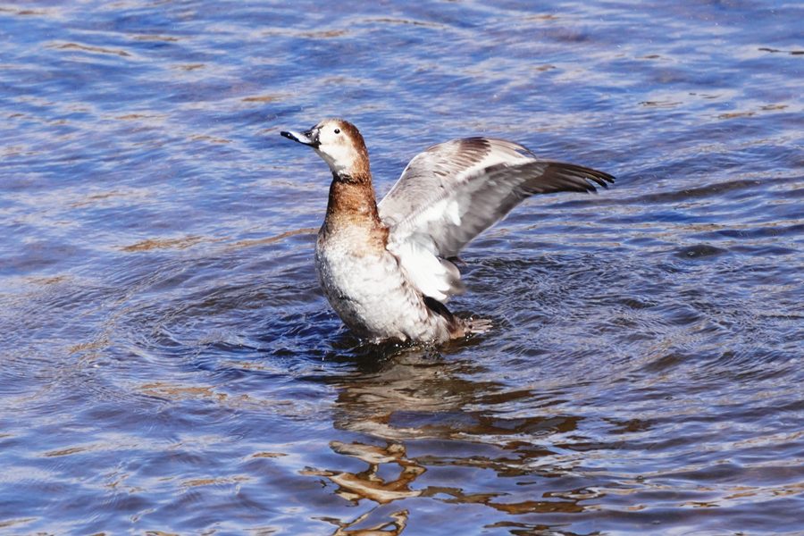 | ホシハジロの雌が水浴びしたり羽ばたいたりしていました。 |