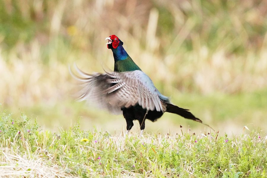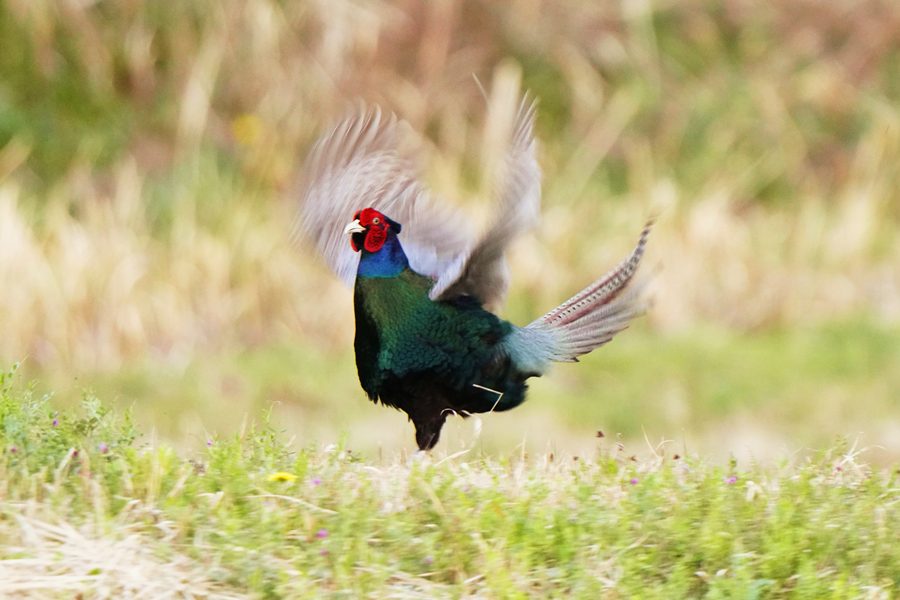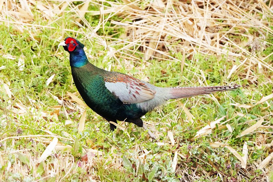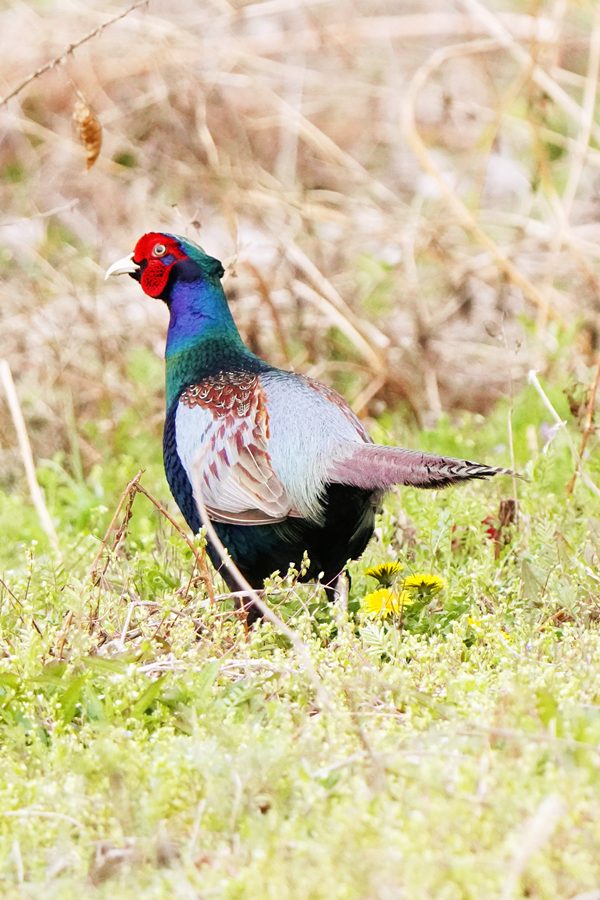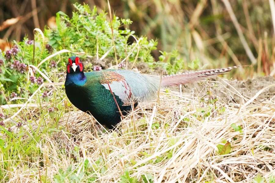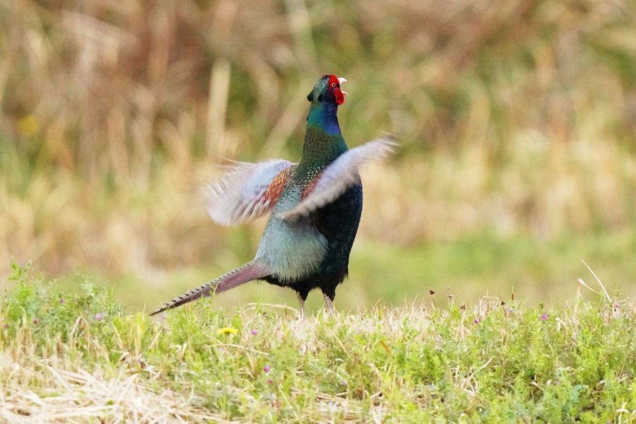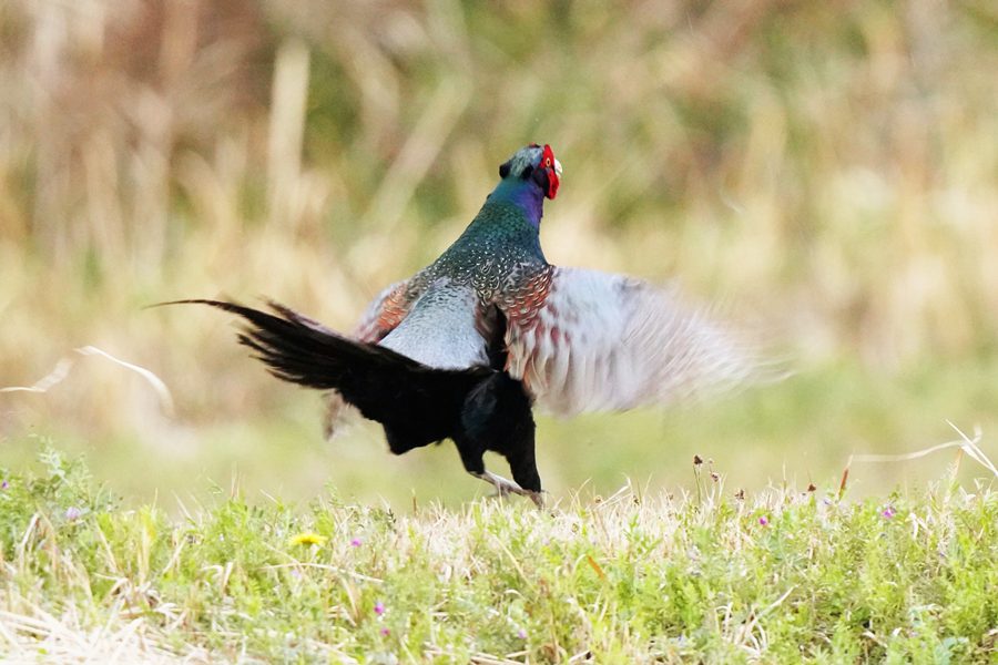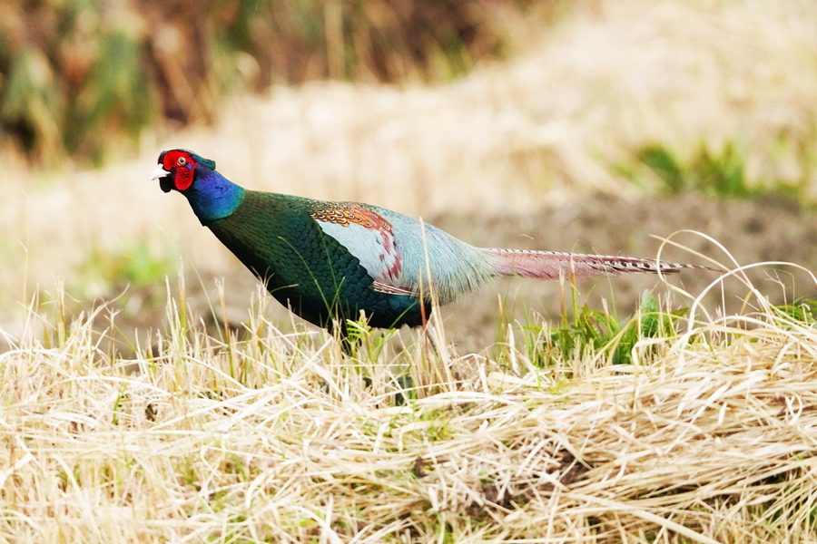 | 近くの大きなため池のそばの水田の畔にキジがいて時々鳴き声を上げて羽ばたいていました。 |