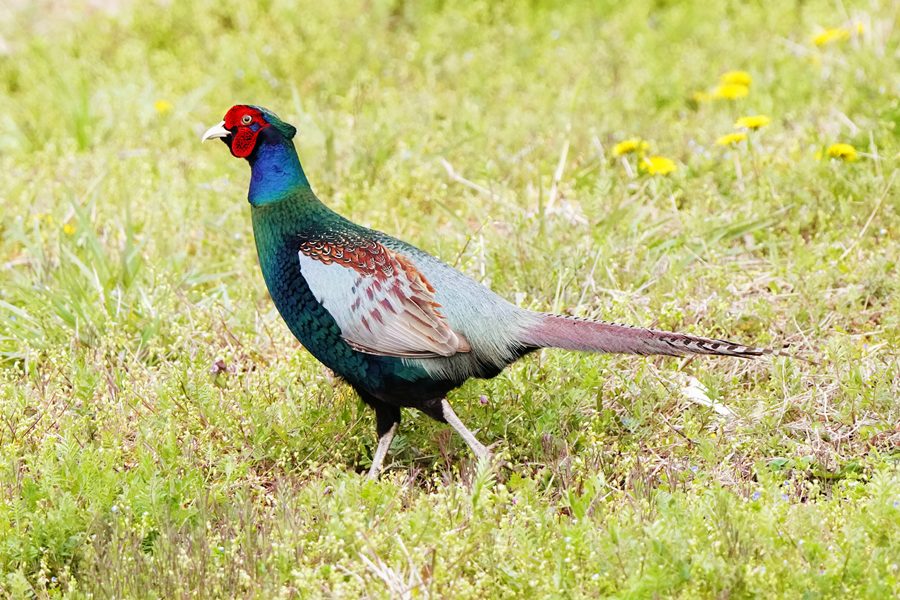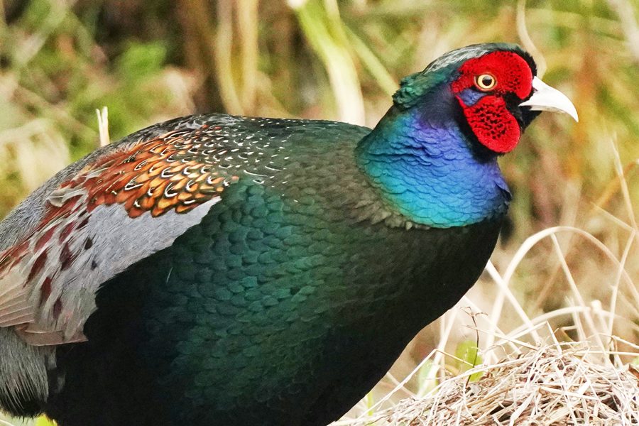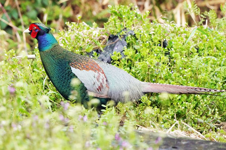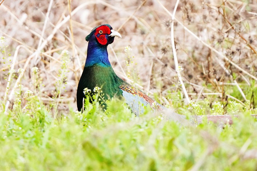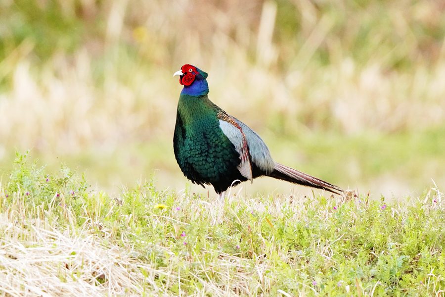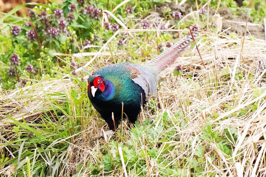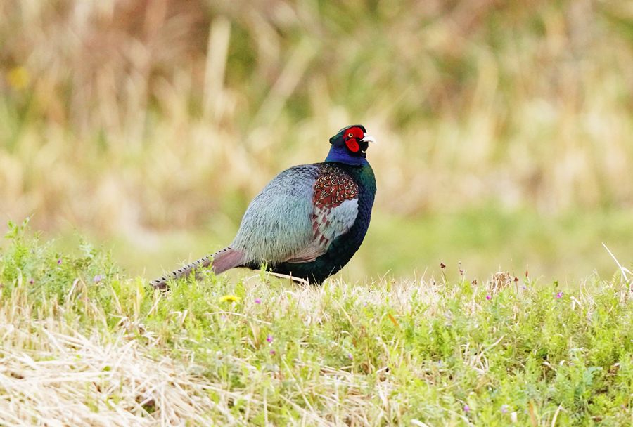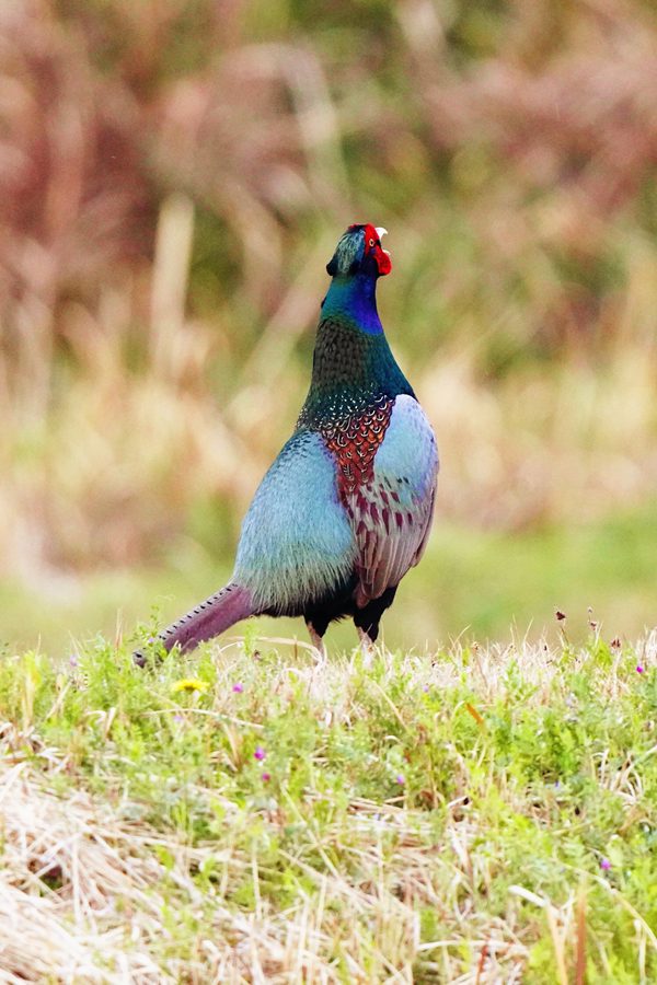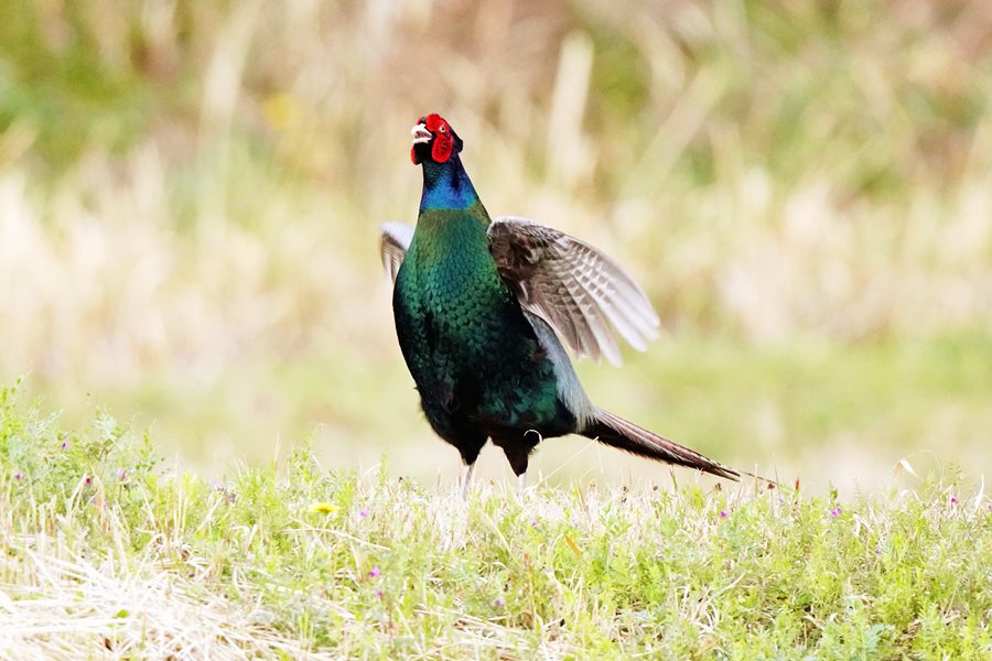 | 近くの大きなため池のそばの水田の畔にキジがいて時々鳴き声を上げて羽ばたいていました。 |