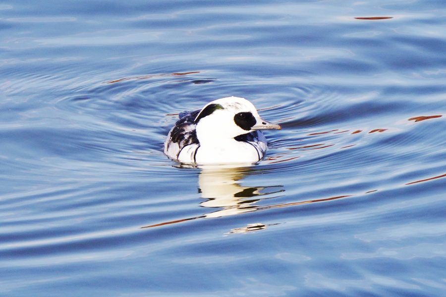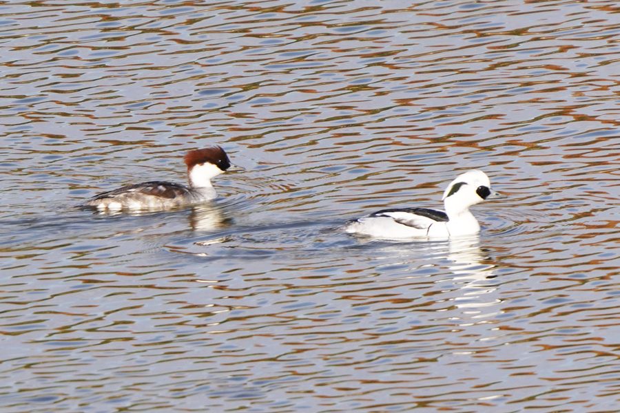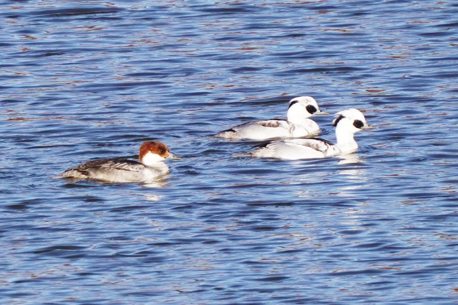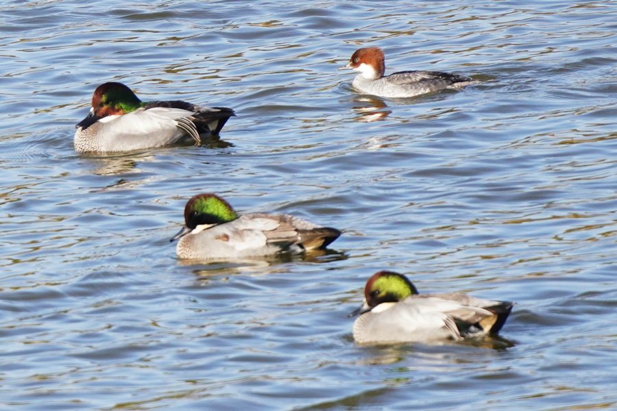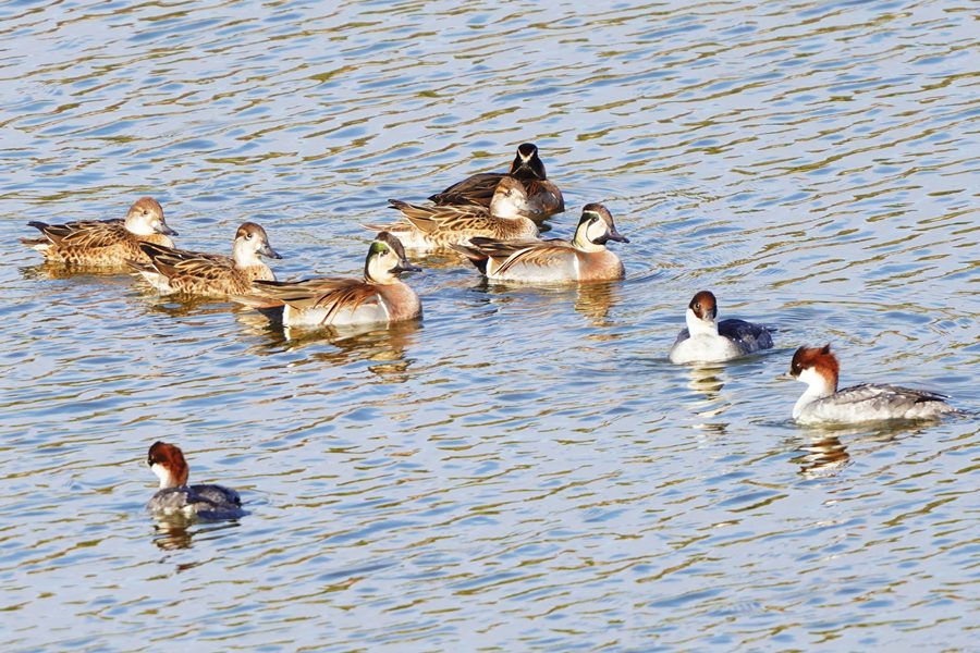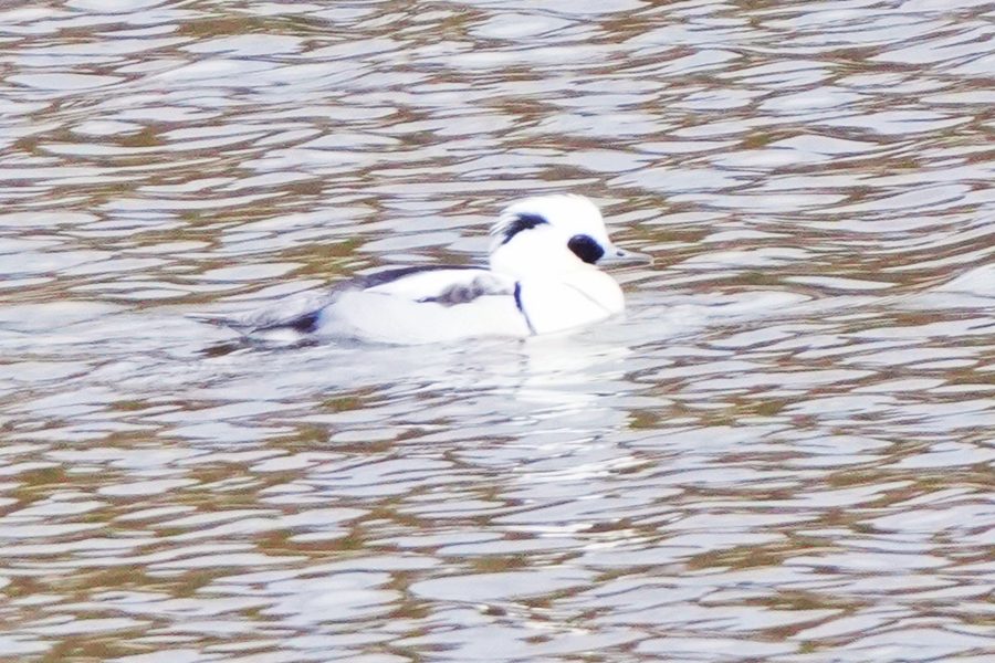 | トモエガモとともにこの日もミコアイサがいました。白い雄はまだ1羽だけで、他は雌とエクリプスです。 |