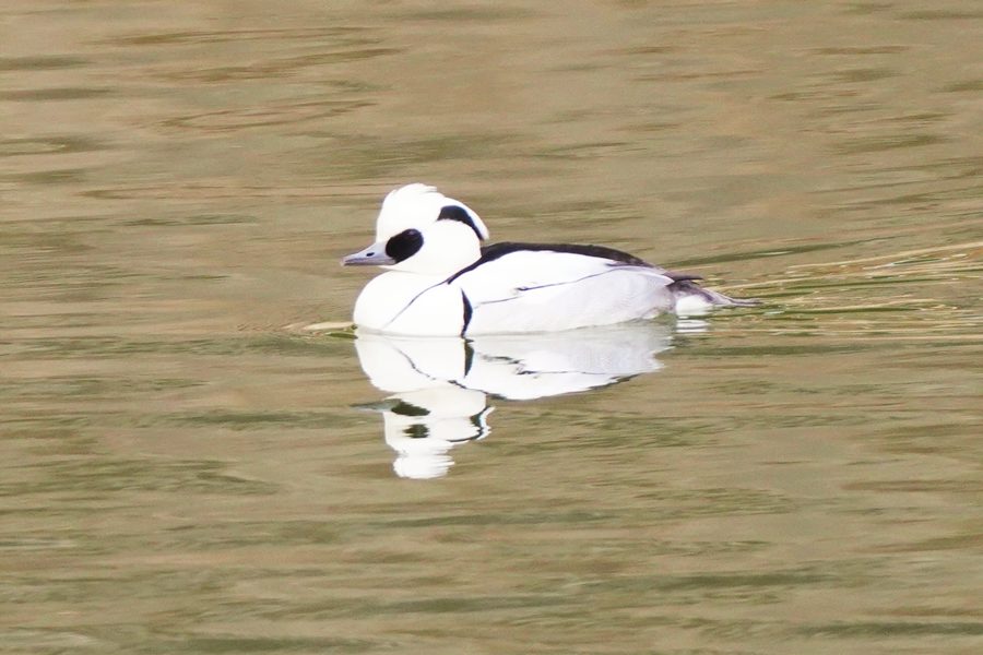 大きなため池の水量は増えず、半分は干上がったままです。それでもカンムリカイツブリと数多くのミコアイサがいたのですか、今日はマガモとカワウ、ホシハジロがちらほらいただけでした。ミコアイサは1羽いただけです。 |
