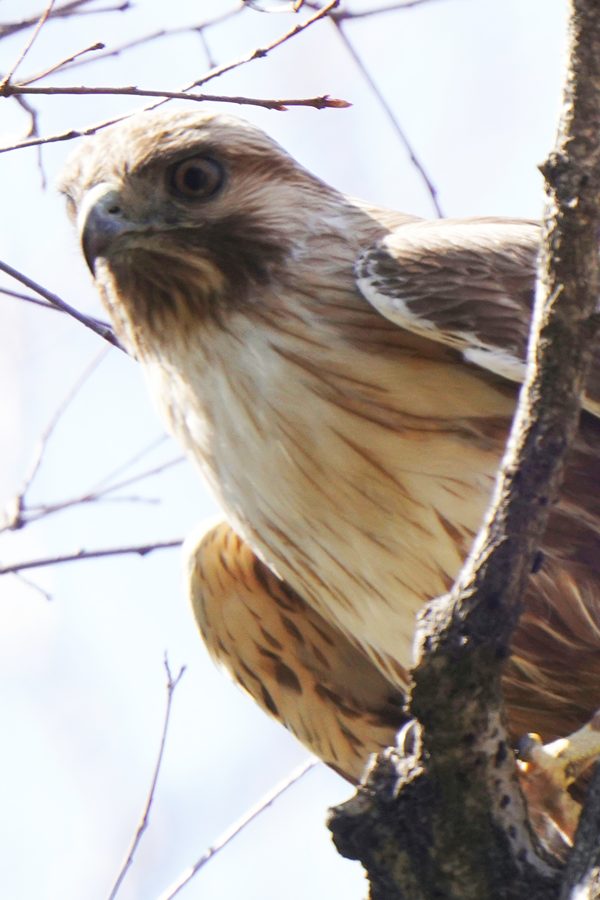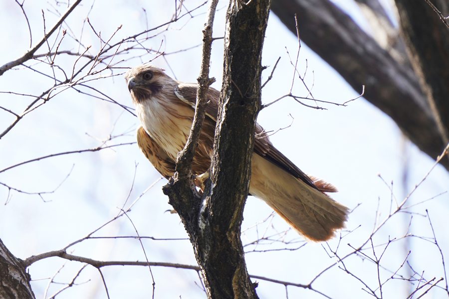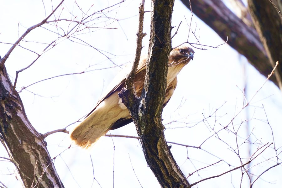 | 突然ルリビタキは飛び去りました。その時、上を見てみると高い木にノスリがとまっていました。 |