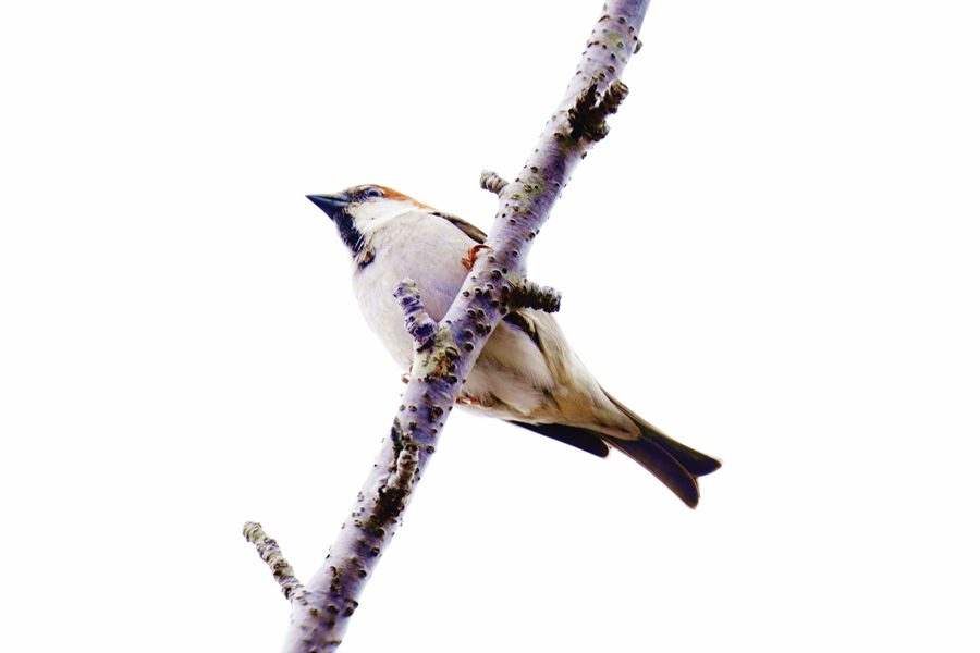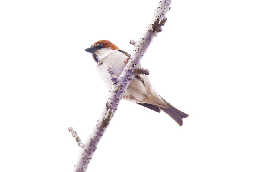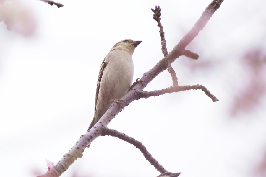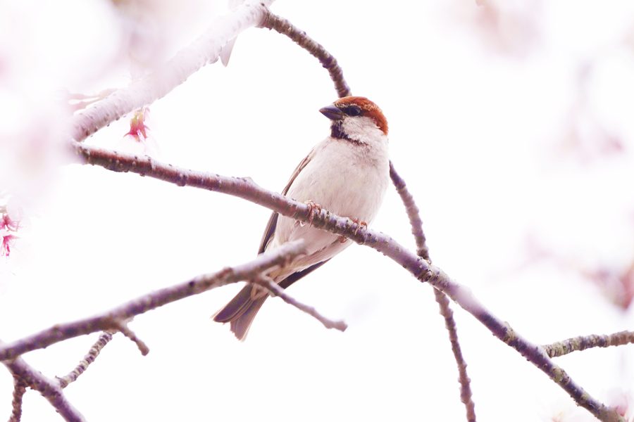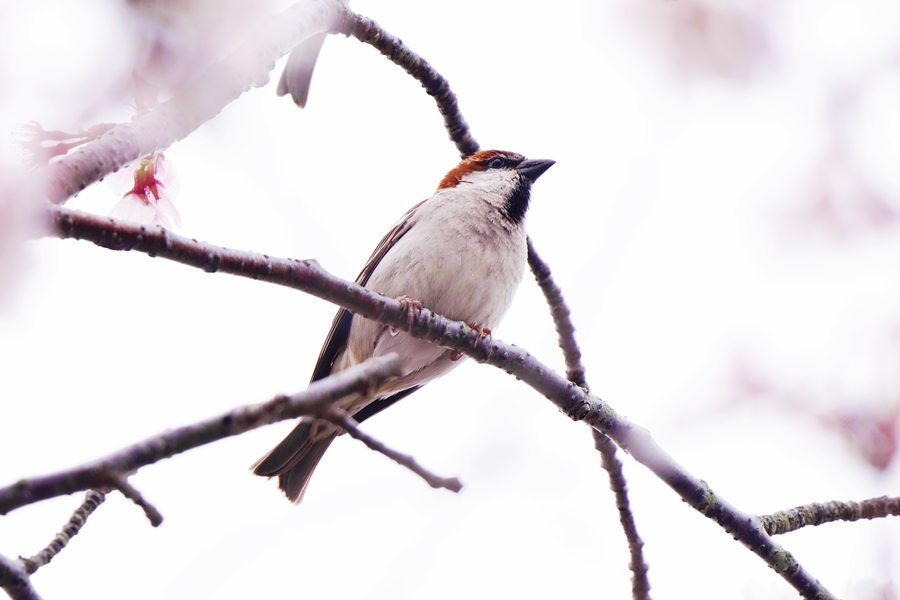 | 飛んで行ったヒレンジャクを探している時、数本の桜からスズメにしては明るく高い声が聞こえました。カメラを向けるとニュウナイスズメでした。 |