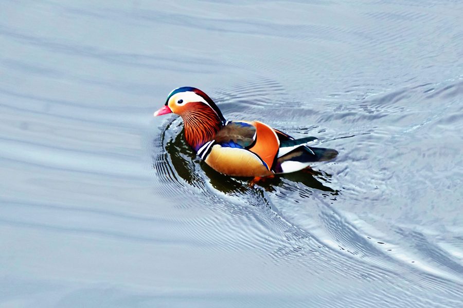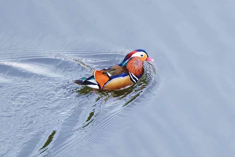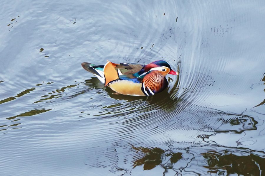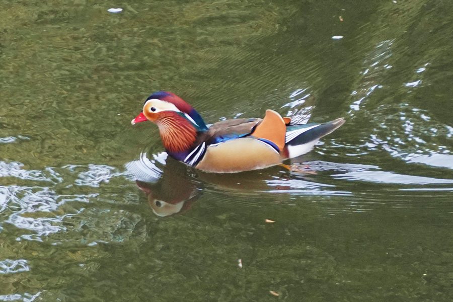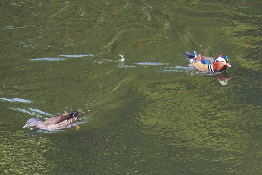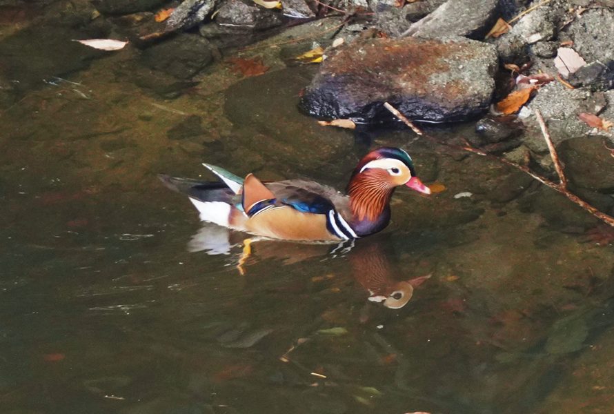 | この秋からオシドリは入っているのですが、数が少なくこの池では20羽以上いるところを見たことがありません。この日も1羽・2羽と岸から岸へと移動する姿を撮影しただけでした。 |