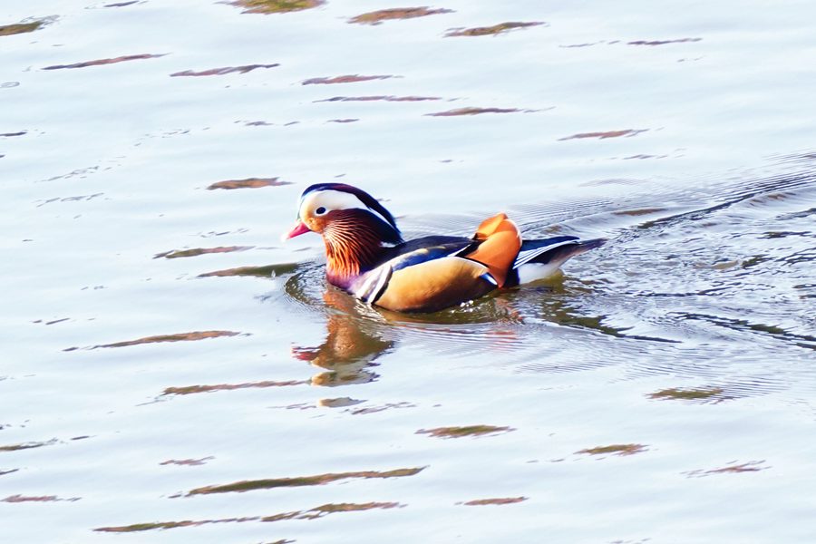 | 良い天気だったのですが、小さな池のため青空が写った水面ではなく、近くの神社の茶色の森が写った水面でしたが、茶色の水面とさざ波が映えて面白い写真になりました。 |