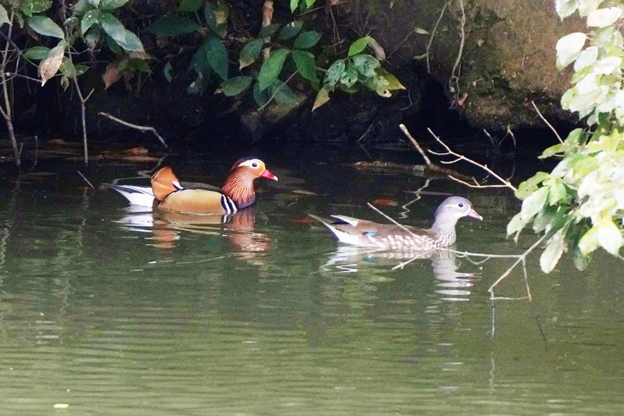 | 前回撮影した14日と同じようにオシドリは岸近くにいて池の真ん中には出てきませんでしたが、岸に上がって休んでいるオシドリは少なく、岸近くで追いかけあいをしたりして、活発に動いていました。 |