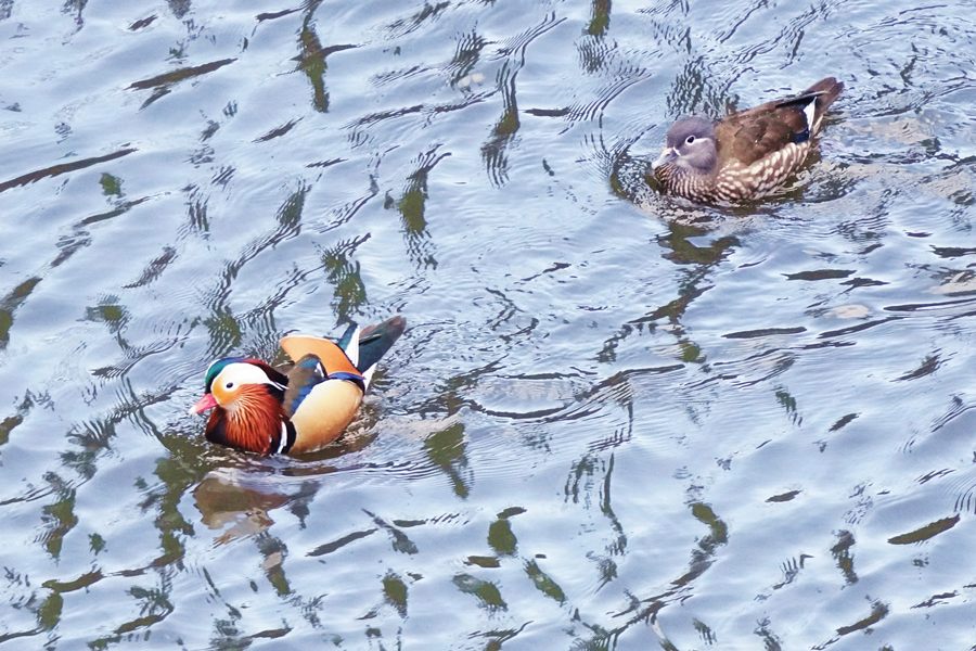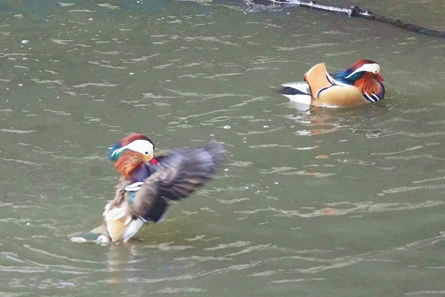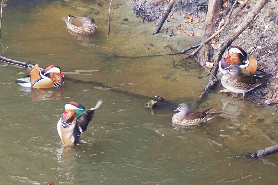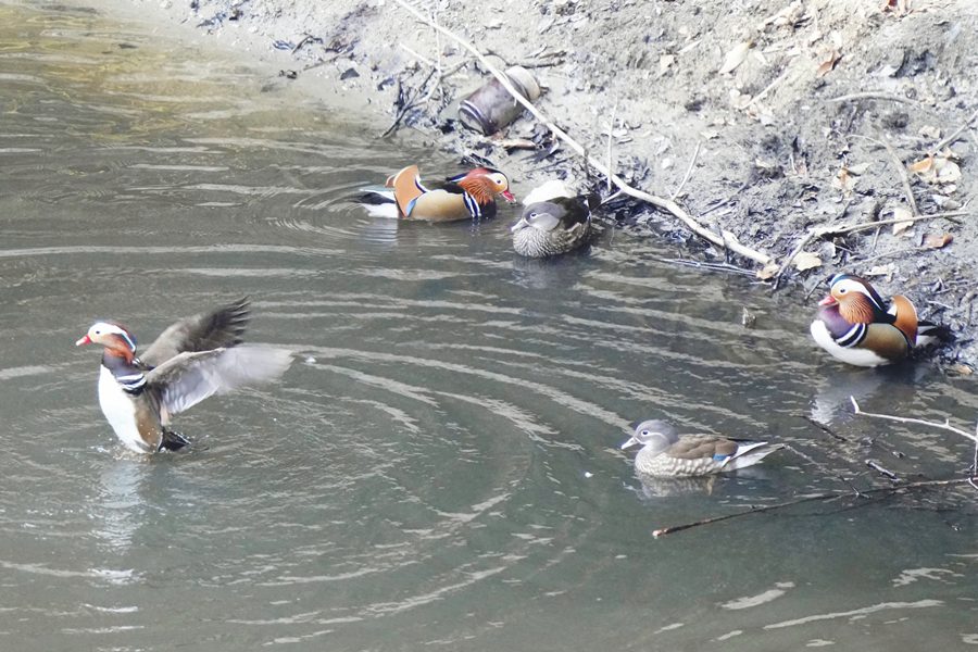 | トモエガモとオシドリは撮影した橋から離れた岸付近にいました。トモエガモは雄3羽です。この日はあまり動きませんてした。 |