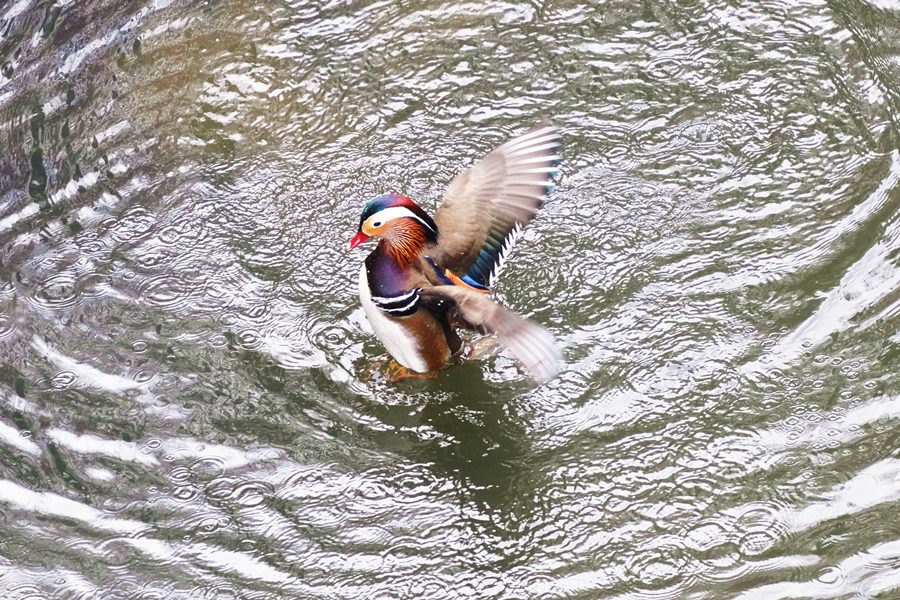 | 早咲きの桜に来たメジロを撮影した後、山を登って山の上の池でオシドリと一緒にいるトモエガモを撮影しました。この日は活発にトモエガモは活動していて、2回池の真ん中にに出てきました。また、水浴びもしました。 |