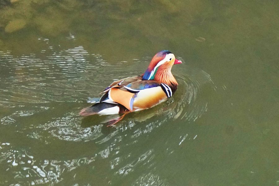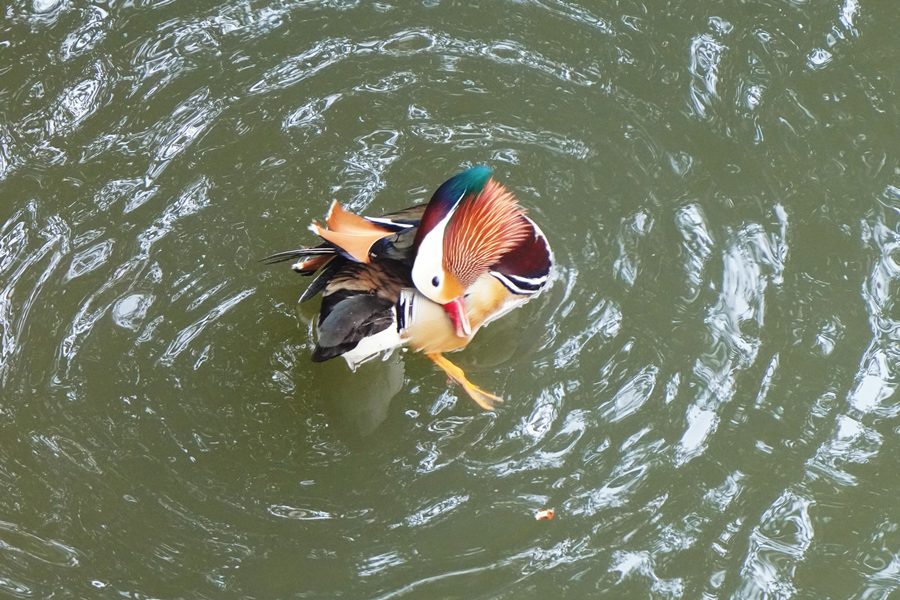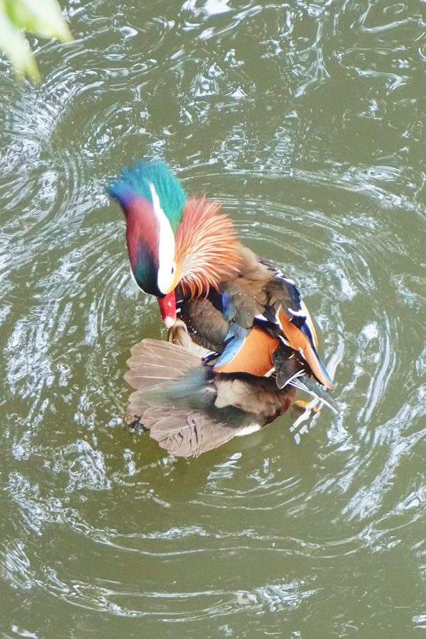 | この日も橋の下近くの岸近くで数羽のオシドリが競うように水に潜り、浮き上がって羽ばたいたり、水を切るように素早く翼を動かして水浴びをしたりしていました。羽繕いをしているオシドリもいました。 |
