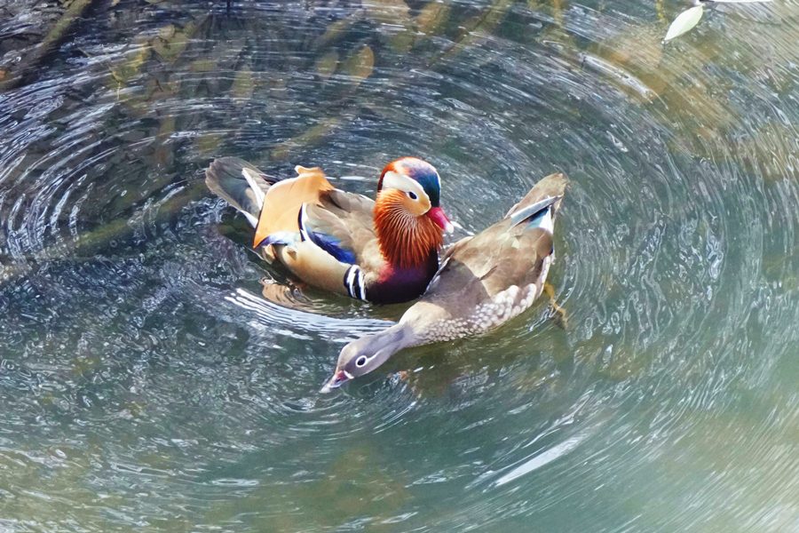 | オシドリの雌が体を伸ばしてうつ伏せ寝をするように水面に浮いていました。その横に寄り添うようにオシドリの雄がいました。 |