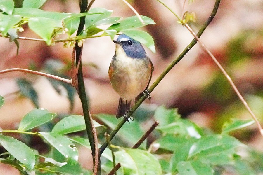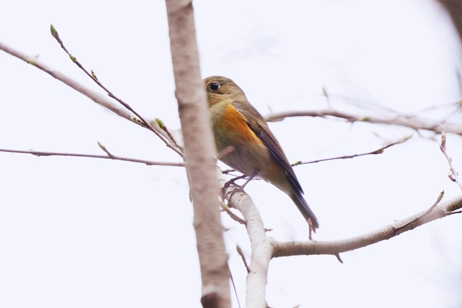 | 今にも雨が降りそうな中、地元の山の上の桜園に行きました。時々パラパラ雨が降っていましたが、カメラをタオルで覆ってルリビタキを待っていると少し離れた木にルリビタキらしき鳥がとまったので連写で2回シャッターボタンを押しましたが、すぐに飛び去りました。撮れたのはルリビタキ♀で、残念ながら枝被りでした。 |