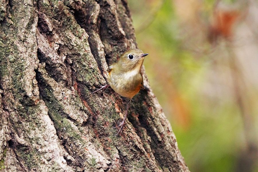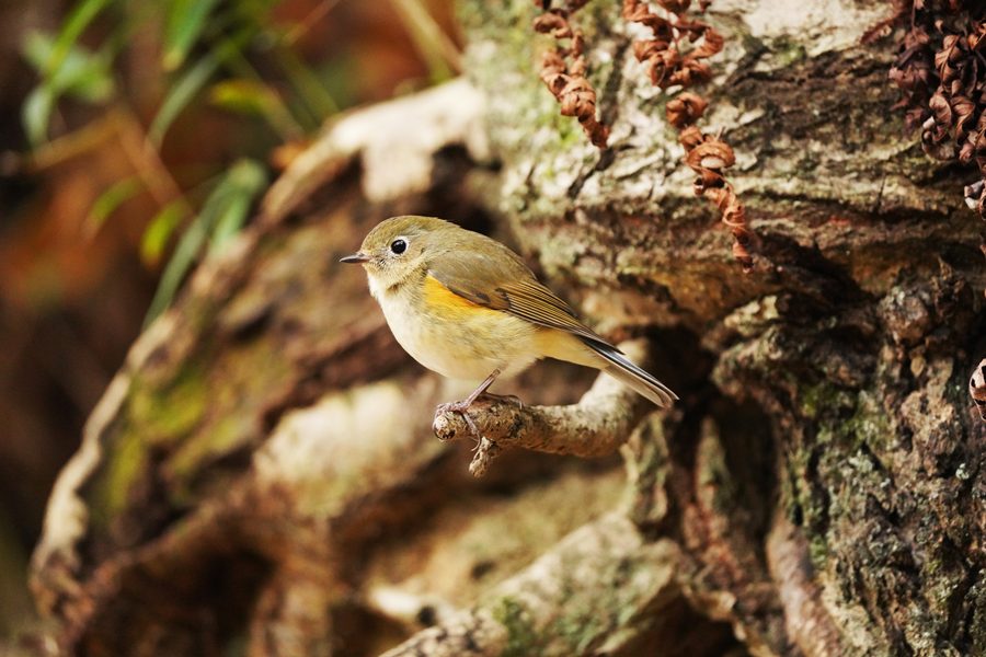 | 12日に撮影したルリビタキ♀です。クロジを撮ろうとこの山に来たのですが、1時間以上待っても姿を見られませんでした。帰ろうとした時ルリビタキ♀がコナラの木の露出し根などに姿を見せました。 |