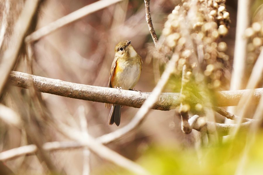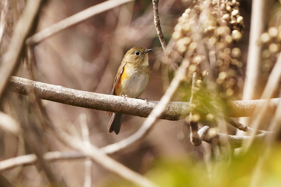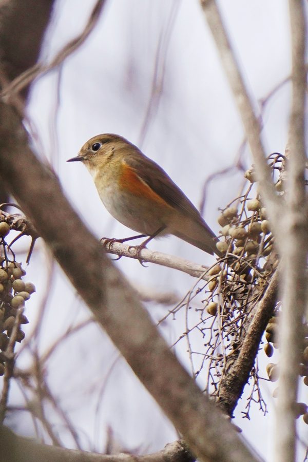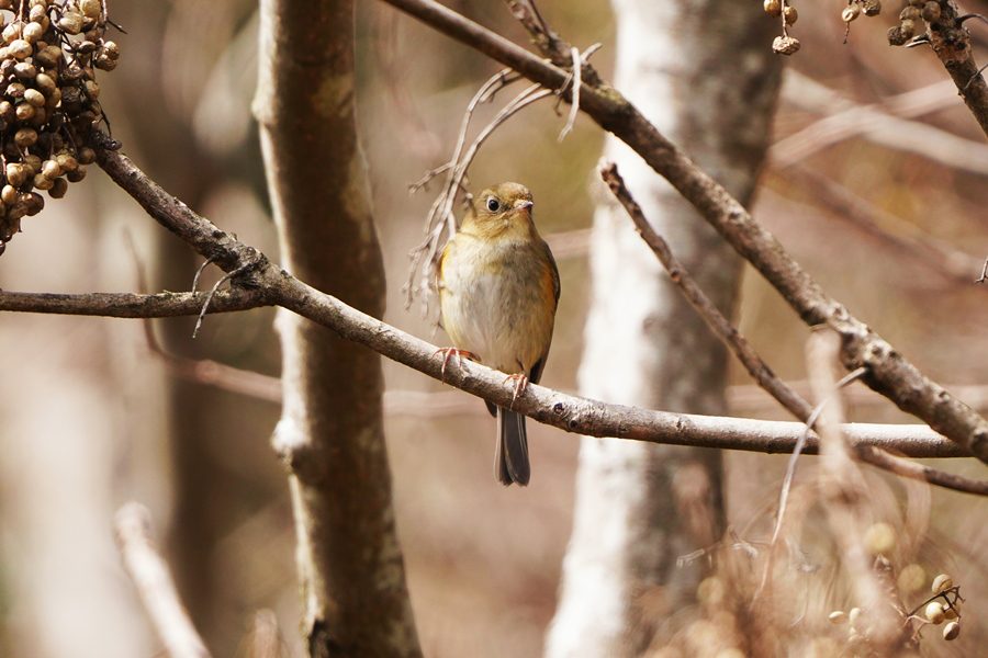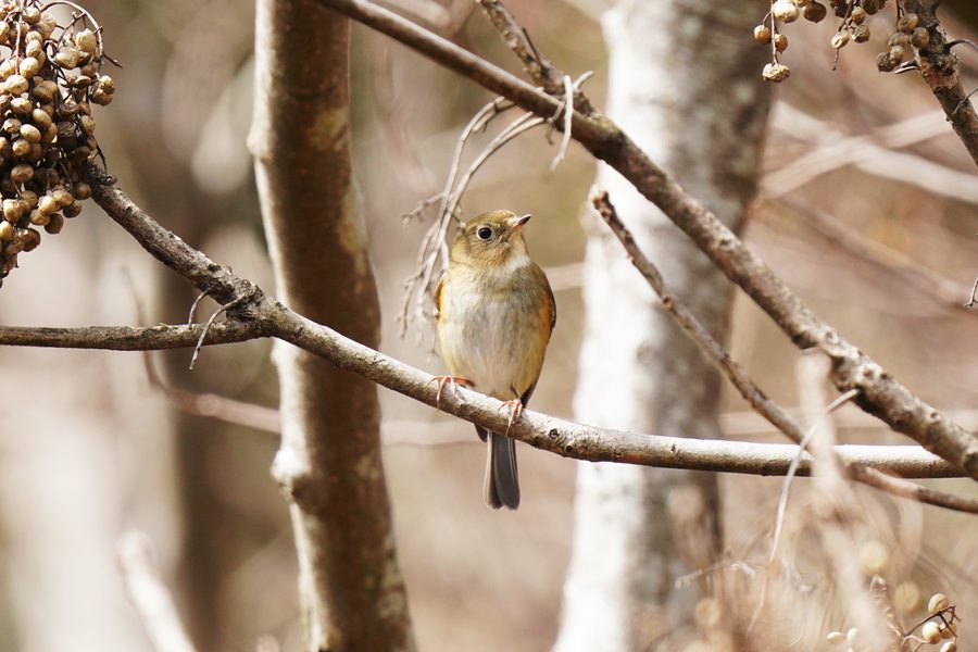| ルリビタキの雌です。尾羽の上面の青い部分が目立たなかったので一瞬、ジョウビタキ♀かなと思ったのですが、翼に白斑がないのでルリビタキ♀だとわかりました。ハゼノキの実を咥えていました。 |