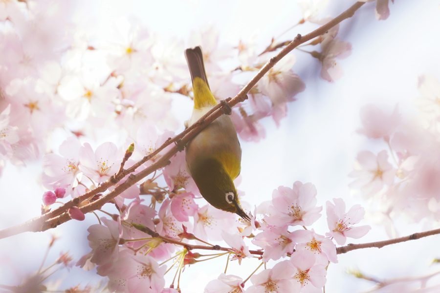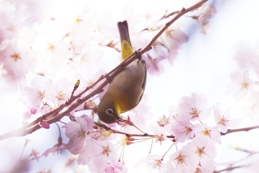 | 。メジロは群れになって桜の蜜を吸いに来ていました。 |