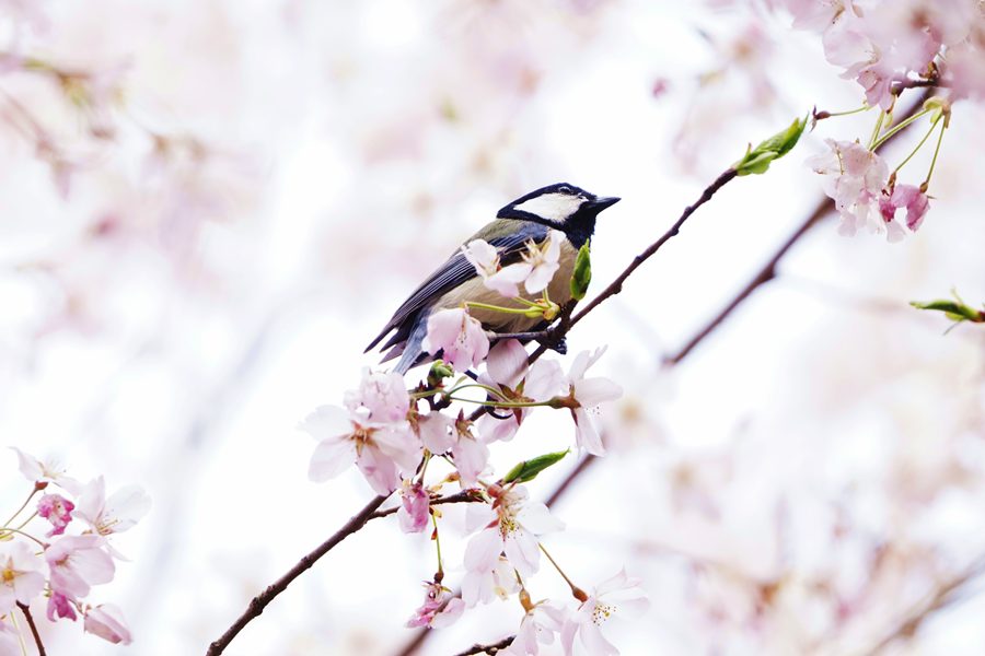 | 桜にとまったルリビタキ♀はすぐに飛んで行ってしまいました。代わりに飛んできたのはシジュウカラでした。 |