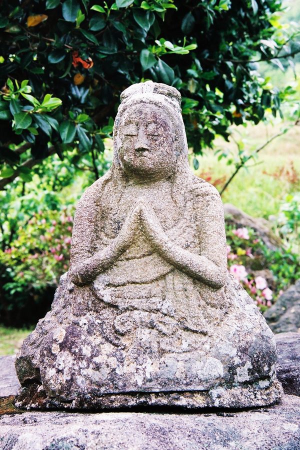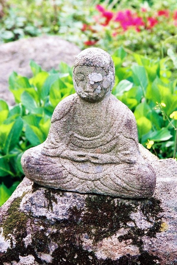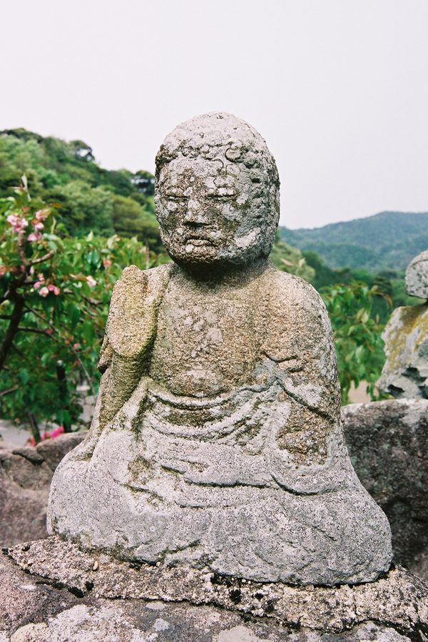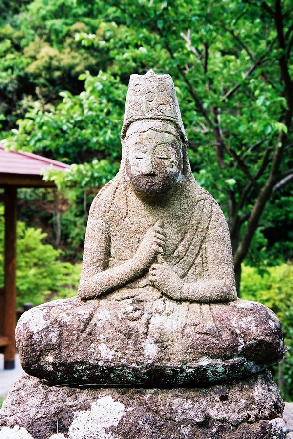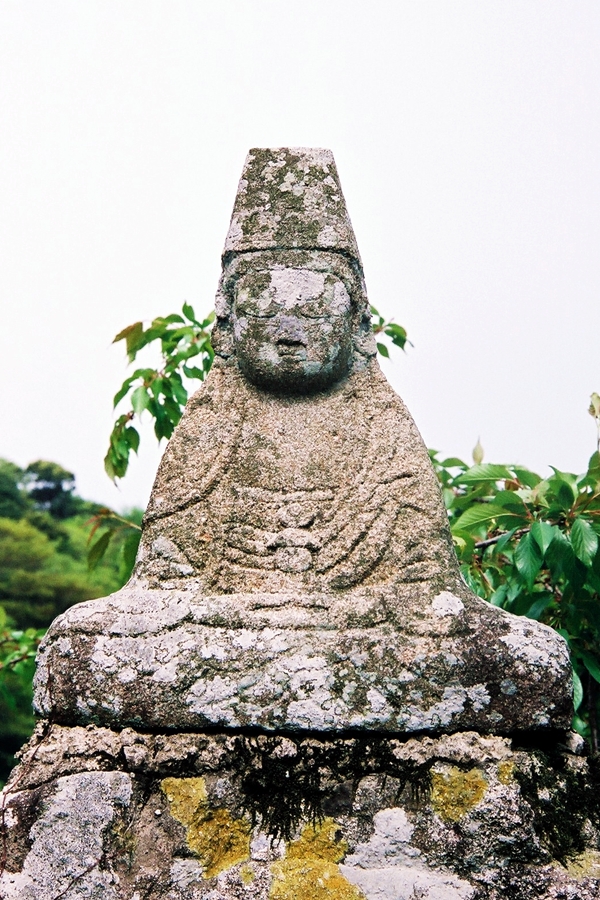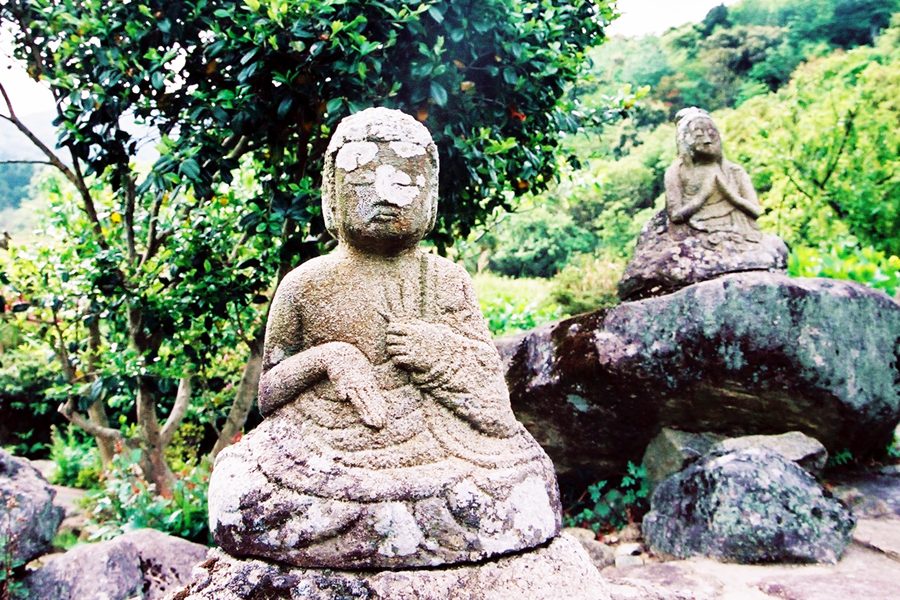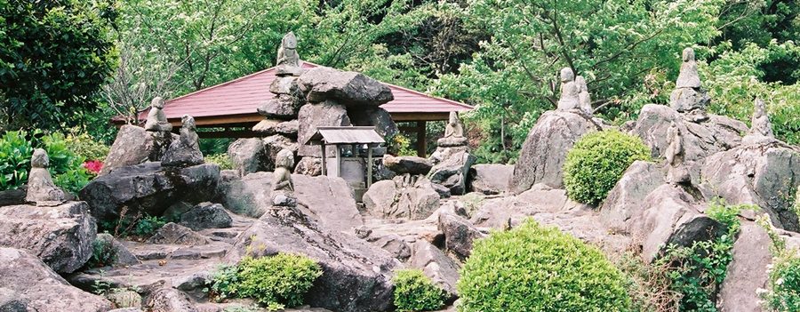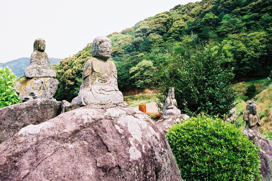 | 岩谷(いわや)十三仏は下関の奥座敷として知られる川棚温泉の北東6kmの中小野・岩屋という山あいの集落にある。公園として整理された露出した岩場の所々に1mにも満たない十三の石仏が安置されている。 石仏は不動明王(初七日)・釈迦如来(二七日)・文殊菩薩(三七日)・普賢菩薩(四七日)・地蔵菩薩(五七日)・弥勒菩薩(六七日)・薬師如来(七七日)・観世音菩薩(百ヶ日)・勢至菩薩(一周忌)・阿弥陀如来(三回忌)・阿閃如来(七回忌)・大日如来(十三回忌)・虚空蔵菩薩(三十三回忌)の十三仏である。十三仏とは死者の追善の法事を修めるとき、その年忌に配当された十三の仏菩薩をいう。十三仏信仰は浄土信仰に基づいて、これらの十三仏を信仰して極楽往生を願うものであり、南北朝時代から信仰が始まったといわれている。 岩谷十三仏は、山口を支配した大内義隆が家臣の陶晴賢の叛乱に敗れた時、一時身をひそめたという岩谷が浴八丈岩に納められていたもので、現在、大小の岩が組み合わされた庭園風の公園の、岩の上に並べられている。 大内義隆が八丈岩を脱出する時、村人に大内家秘伝のばんばら楽(大内楽)の巻物一巻をあたえた。陶晴賢が毛利元就に破れた、弘治元年(1555)ごろ、この一帯が大旱魃に襲われ、雨ごいのためにと熊野神社にこのばんばら楽(大内楽)を奉納したところ、すぐに大雨が降り旱魃を免れた。そこで、大内義隆の供養として、八丈岩に十三体の石の仏像を造り奉納したとのがこの十三仏であるという。 一体一体、丁寧に彫られていて、柔和で愛らしい顔の千手観音像やすました穏やかな表情の大日如来や弥勒菩薩、哲学者のような風貌の釈迦如来など魅力的な石仏群である。仙人のような表情の文殊菩薩と普賢菩薩の2体は少し離れた岩の上に安置されている。 |