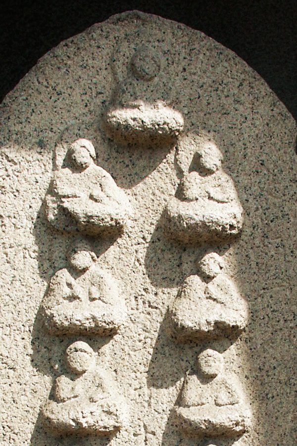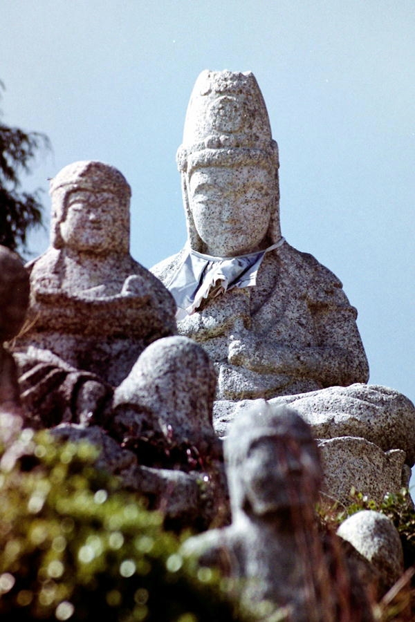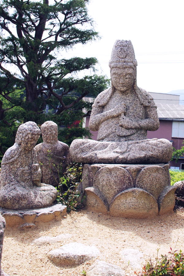 | JR呉線の忠海駅を下車し、北西に10分ほど歩くと地蔵禅院という寺がある。その寺の横手が黒滝山の登山口である。約30分ほどで山頂に達する。この登山道に沿って西国三十三観音磨崖仏が岩肌に彫られている。十三仏は黒滝山中腹の登山道脇にある。山型の自然石の表面を平らにして十三の仏が、一番上の4段目に2体、3段目に5体、2段目と1段目にそれぞれ3体、半肉彫りされている。ふっくらとした願容のかわいらしい十三仏である。(石造十三仏碑は一番上に一体(虚空蔵菩薩)をその下に残りの十二仏を4段に各3体、もしくは3段に4体を配置するのが一般的である。)側面に昭和五年の紀年銘がある。 | ||