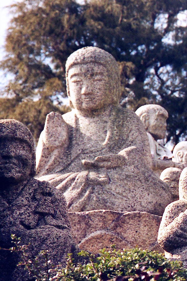 | 頂上には金剛界の五智如来が安置されている。中央に座しているのが智拳印の金剛界大日如来である。その周りをとり囲むように阿しゅく如来・宝生如来・無量寿如来(阿弥陀如来)・不空成就如来がある。リニューアルにあたって3回訪れた竹成五百羅漢の写真を見直してみると、大日如来以外の四仏をほとんど撮影していなかった。 |