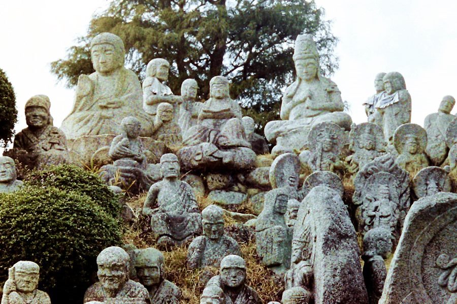 | 御在所山の麓、湯の山温泉で知られる菰野町の北部、菰野町竹成の大日堂境内に三重県の史跡に指定されている五百羅漢石仏がある。大日堂は文明13(1481)年作の大日如来像(県指定有形文化財)を本尊とする寺で現在本尊を納めた小さなお堂と、前庭築山の五百羅漢石仏が残るのみである。 五百羅漢石仏は高さ約7mの四角錐の築山をつくり、頂上に金剛界大日如来と四方仏を置き、その周りに如来・菩薩・羅漢をはじめとした500体ほどの石像を安置したもので、七福神や天狗、猿田彦などもあり、大小様々な石仏・石神が林立する様は壮観で、見応えがある。(現在、廃仏毀釈などて一部破損し、468体の石像が遺っている。) この石仏群は江戸末期、当地竹成出身の真言僧神瑞が喜捨を求めて完成したもので、神瑞和尚は中興開山照空上人として尊崇されている。発願は嘉永5(1852)年2月で、桑名の石工、藤原長兵衛一門によって慶応2(1866)年に完成した。 |