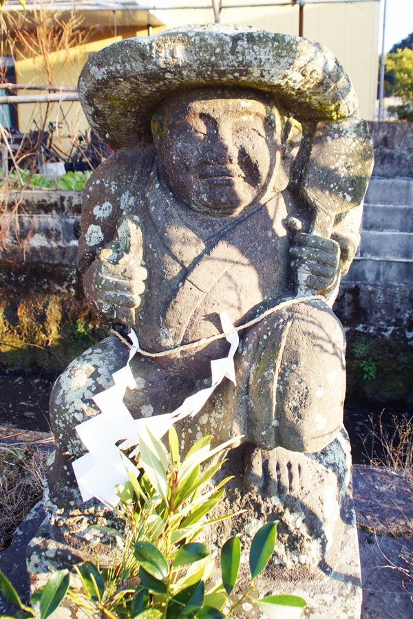 | 国道10号線の「国分鎮守尾」の交差点と県道491号線をつなぐ橋が鎮守尾橋である。この橋の近くにあったため霧島市教育委員会刊の「霧島市の田のかんさぁ」では「鎮守尾橋の田の神」と名付けられている。「霧島市の田のかんさぁ」の写真では半分草むらにうずまった状態であったが、撮影した時は県道491号線脇に移され石碑や水神などとともに丁寧に安置されている。この像も「口輪野の田の神」と同じく石工田端喜蔵の刻銘がある。像高67㎝で「口輪野の田の神」と同じように笠のようなシキをかぶり長袖の衣を着た右手にメシゲ、左手に椀を持った立像である。残念ながら顔は大きく破損していて「口輪野の田の神」のような笑い顔は見られない。昭和期の作なので人為的に破損したとしか考えられない。 |