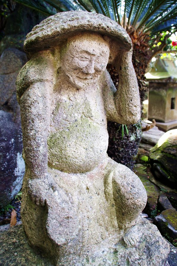 | 霧島市は平成の大合併よって2005年に国分市・隼人町・福山町・溝辺町・横川町・牧園町・霧島町の1市6町が合併して誕生した。人口及び面積ともに鹿児島県下第2位の自治体である。「大隅の田の神さあ5」は霧島市の隼人地区と国分地区の田の神さあを紹介する。霧島市で唯一、県指定有形民俗文化財それている田の神は隼人町の大隅国一之宮の鹿児島神宮の神田の奥に祀られている「宮内の田の神」である。メシゲと椀を持って田の神舞を踊る田の舞型田の神の代表的な田の神像である。隼人町の「見次の田の神」は両手でメシゲを持った田の舞型の田の神である。国分湊の「湊の田の神」は大隅半島でよく見かける右膝を半ば立てた趺座の田の神で斜めに被った大きなシキと、穏やかに微笑んだ顔が印象的な像である。この地方で特色ある田の神としてあげられるのが昭和期に造られた右手でメシゲを立てて持ち、左手で椀を持って、腰かけているように見える中腰の田の神である。隼人町小浜の「埒上の田の神」・「早鈴神社西の田の神」や国分上小川の「森ノ木の田の神」などである。丸顔で微笑む顔が愛らしい田の神である。 |