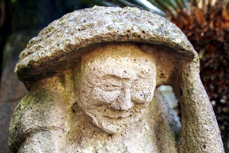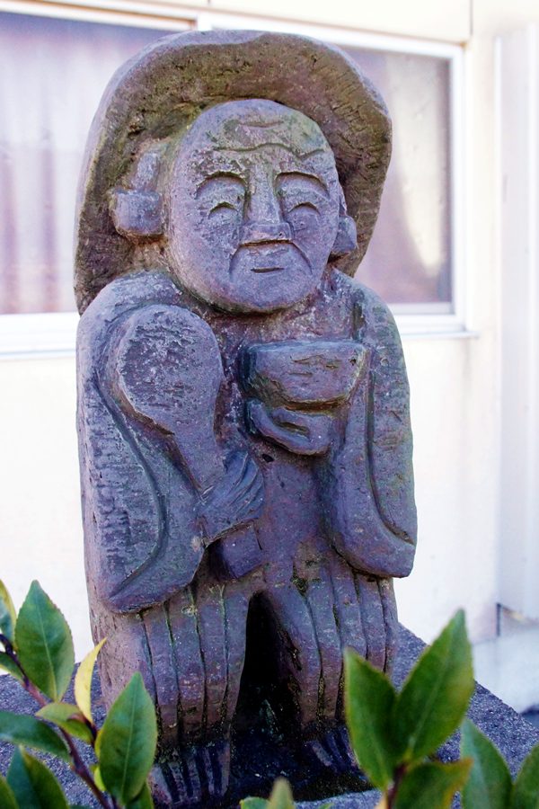 | 加治木郷土館の庭に置かれている田の神で「日木山里の田の神」や「新中の田の神2」同じく右手にメシゲを持ち、左手で頭にかぶったシキを押さえて中腰で田の神舞を踊っている田の神である。もとは個人宅にあったもので町へ寄贈されたものである。被っているシキは「日木山里の田の神」と同じような笠のような形をしている。 |