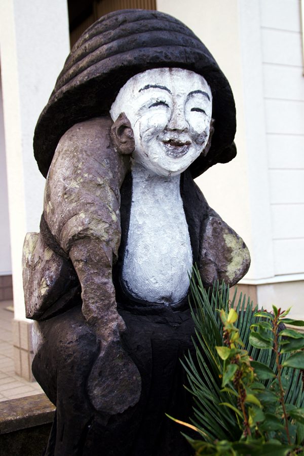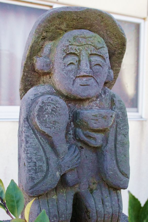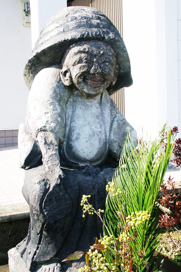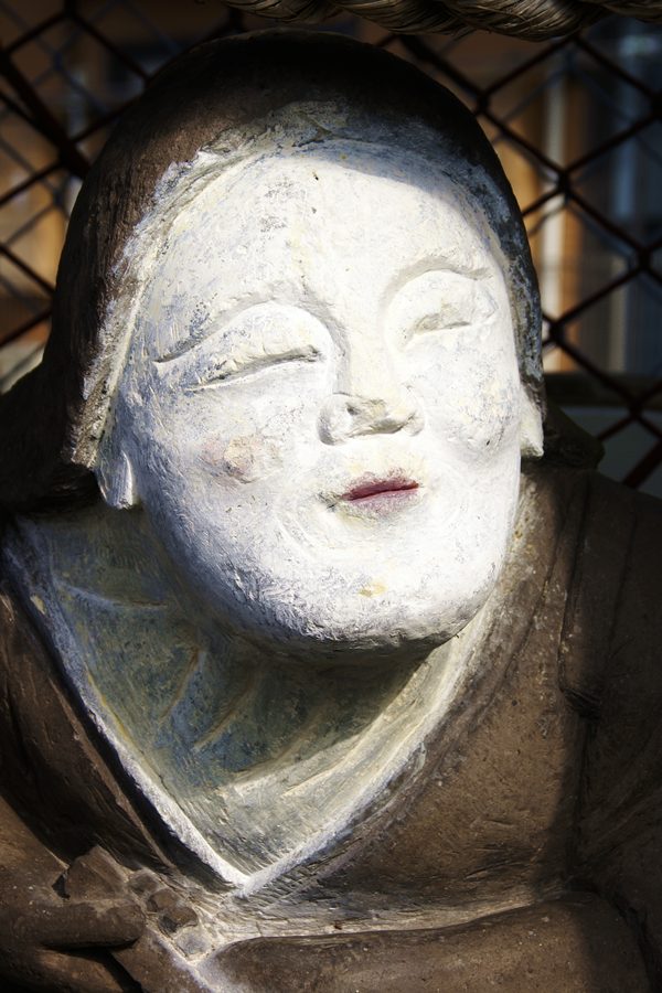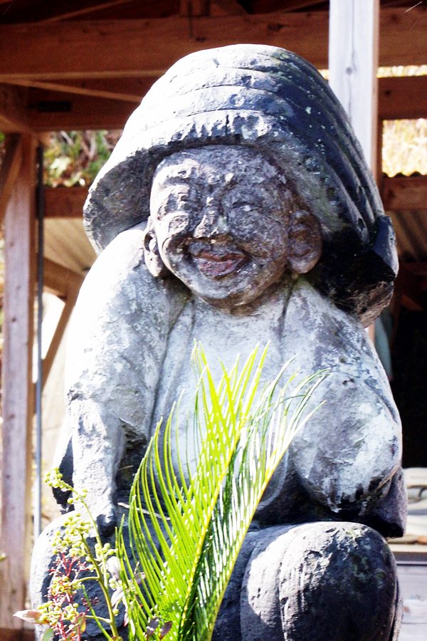 | 「西ノ原の田の神」は西之原公民館の玄関の前に祀られている。「新中の田の神2」とよく似た田ノ神で、螺旋状の編み目の大きく厚いシキをかぶり、右手にメシゲを下げて持ち、左手でかぶったシキをおさえていたと思われるが左手は欠損している。丸顔に庶民的な笑顔も「新中の田の神2」と目鼻口の表現は同じであるが、おおざっぱな表現の「新中の田の神2」に比べると巧みな表現でとても愛らしい。この田の神も昭和59年の東京での「ほほえみの石仏展」に出品された。 この田の神は3回訪れたが最初に撮影した時は唇に赤い彩色の後が少し残っているだけで、巧みな愛らしい笑顔の表現がよくわかる写真となった。2回目の時は雑な化粧(彩色)が目立ったので掲載しなすった。2回目の時は白塗りの顔の化粧でつくった笑いになっていた。 |